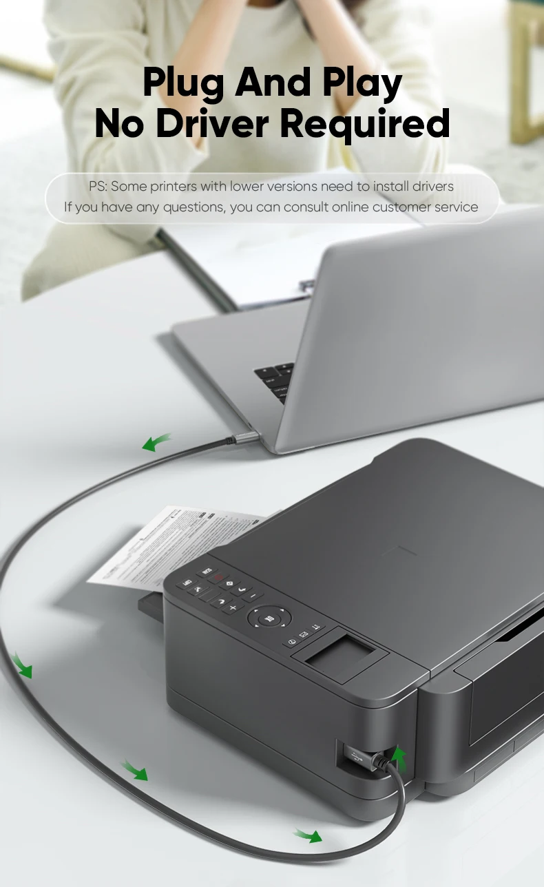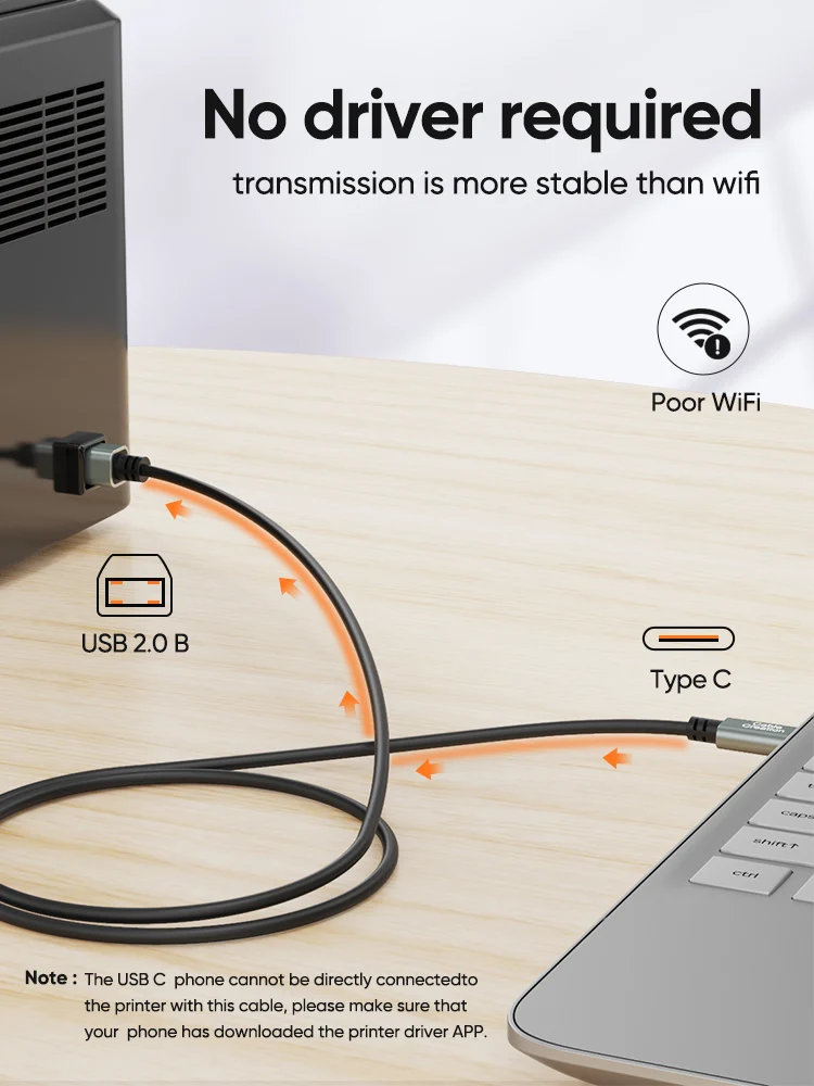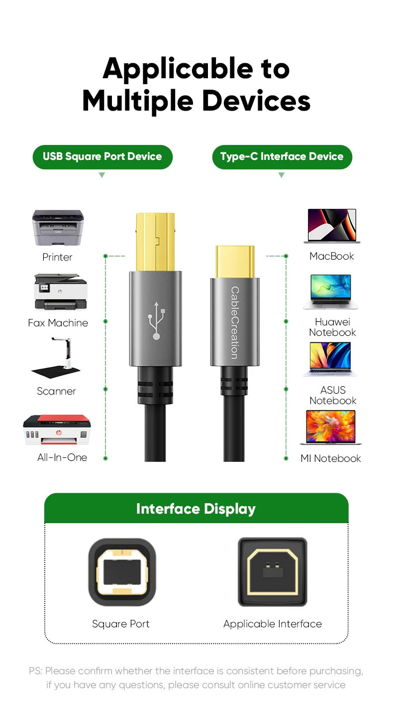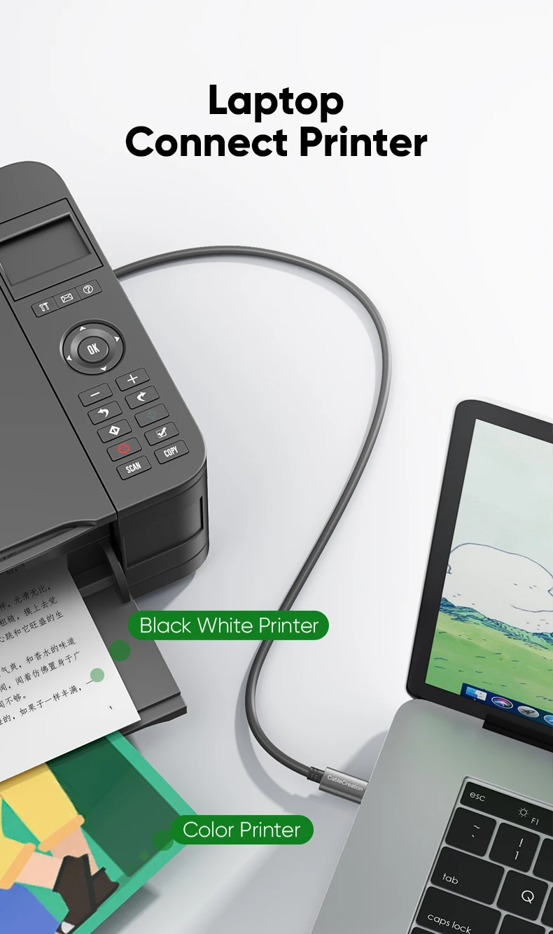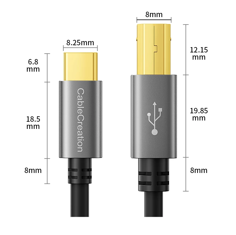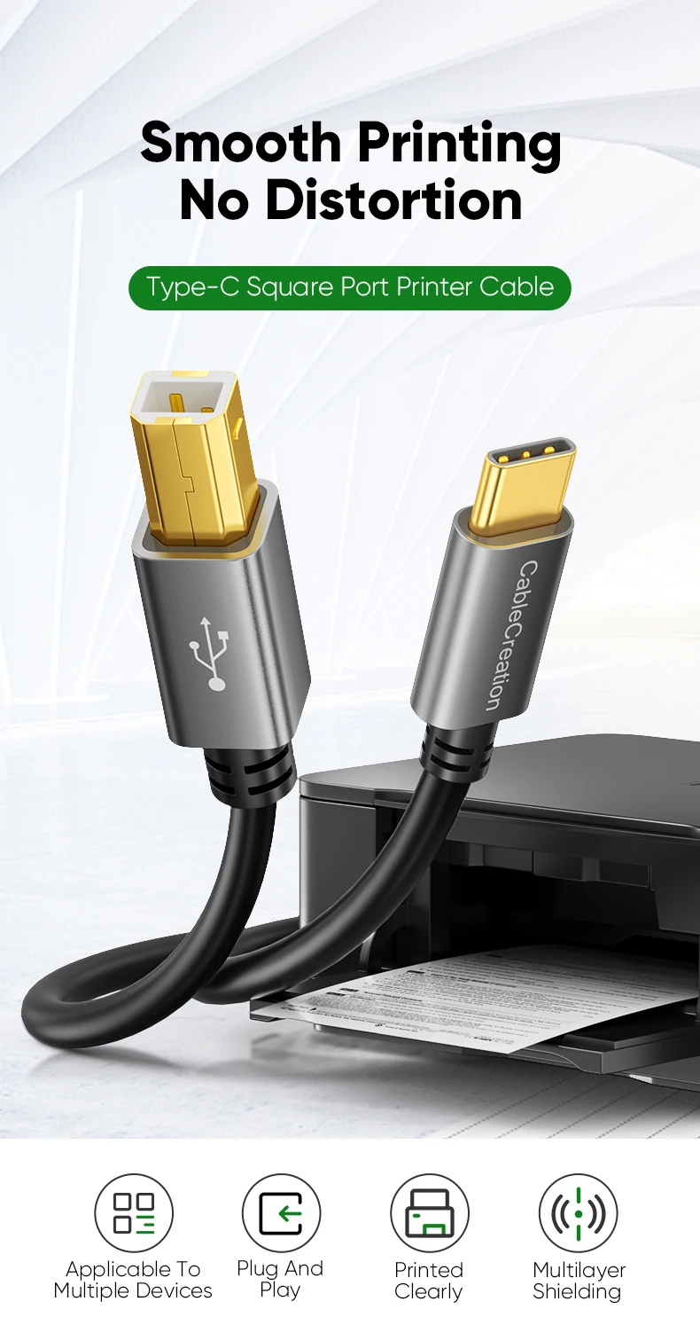 CableCreation Type C printer cable is designed to connect your USB C enabled laptop or PC to USB 2.0 type B devices and peripherals, such as printers, scanners, printer switch hubs, digital piano, MIDI controller, electric keyboard, etc.